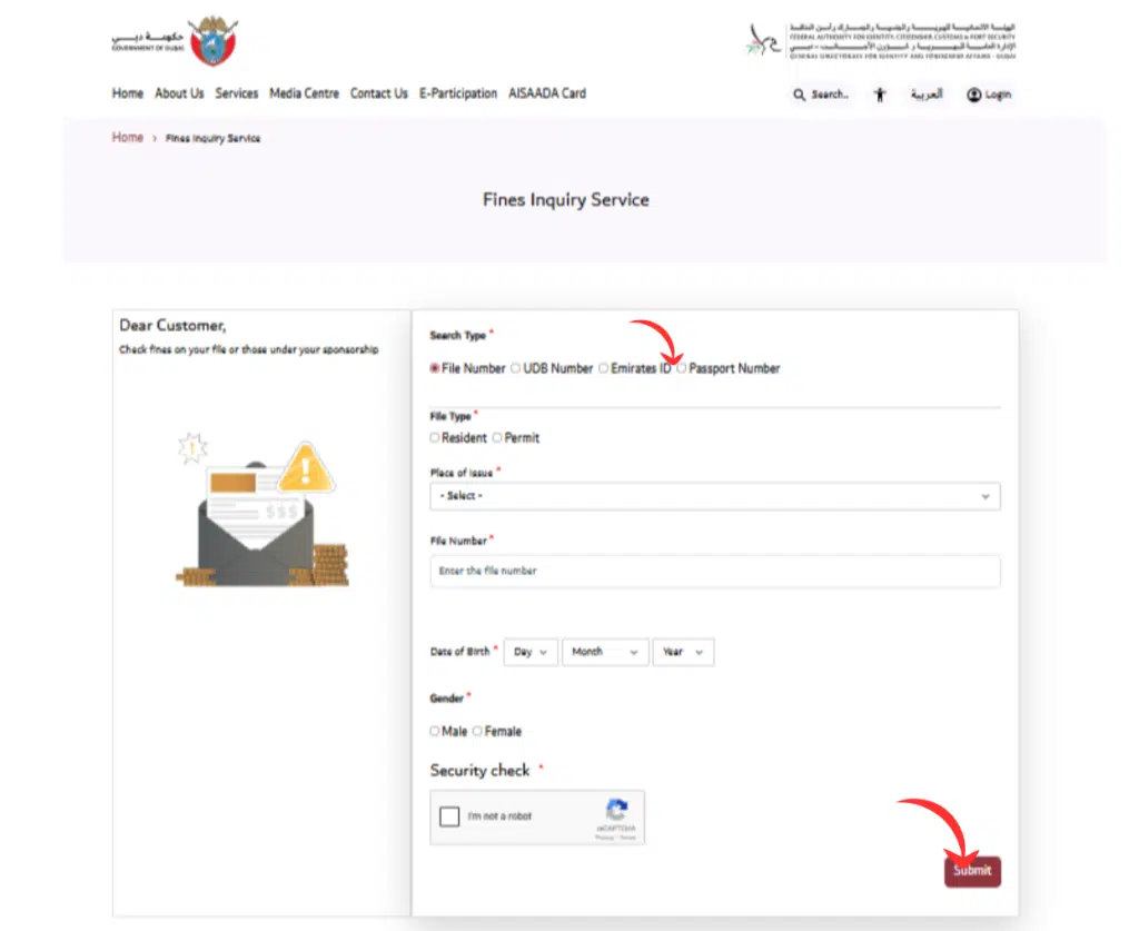 Visit the services of the GDRFA site and choose the Fine payment section.
